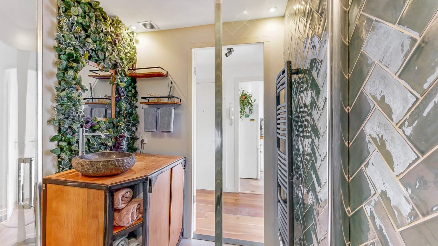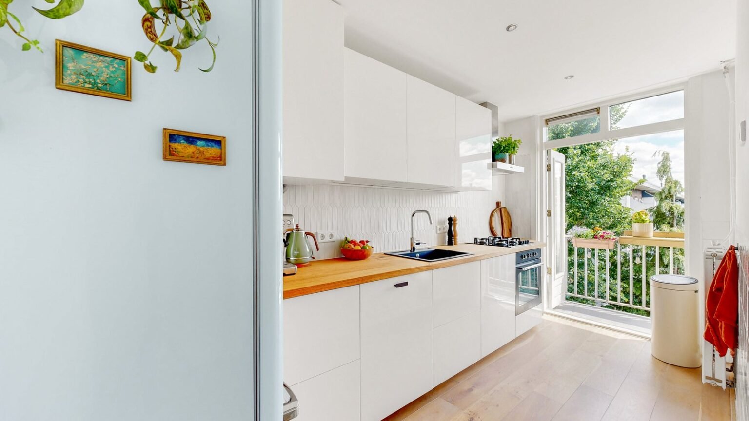De moderne keuken (vernieuwd in 2021) is voorzien van alle gemakken: een 4-pits gaskookplaat, oven, vaatwasser, koelkast met vriesvak, afzuigkap en inbouwspotjes. Ook vanuit de keuken is er toegang tot het zonnige balkon.