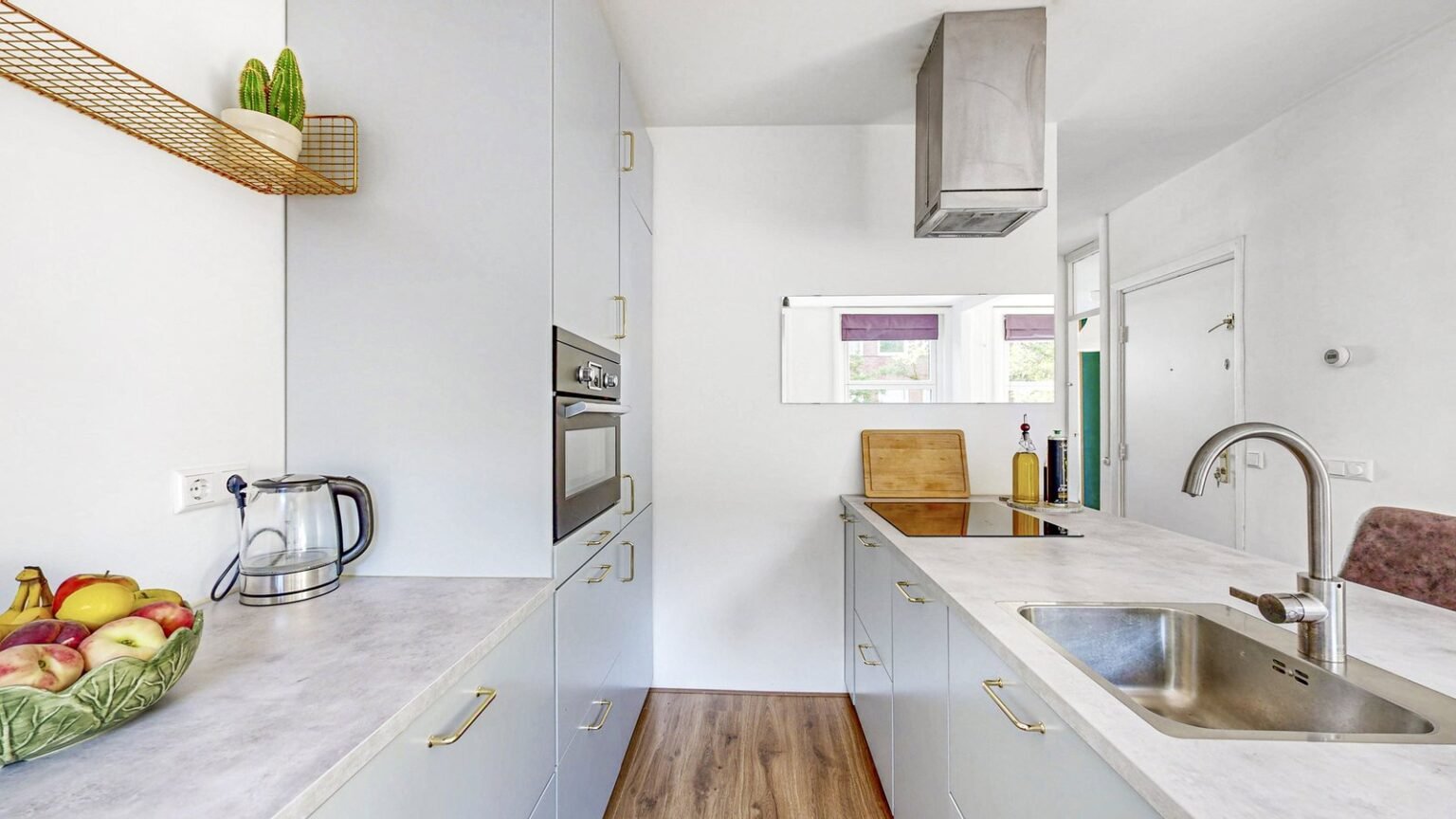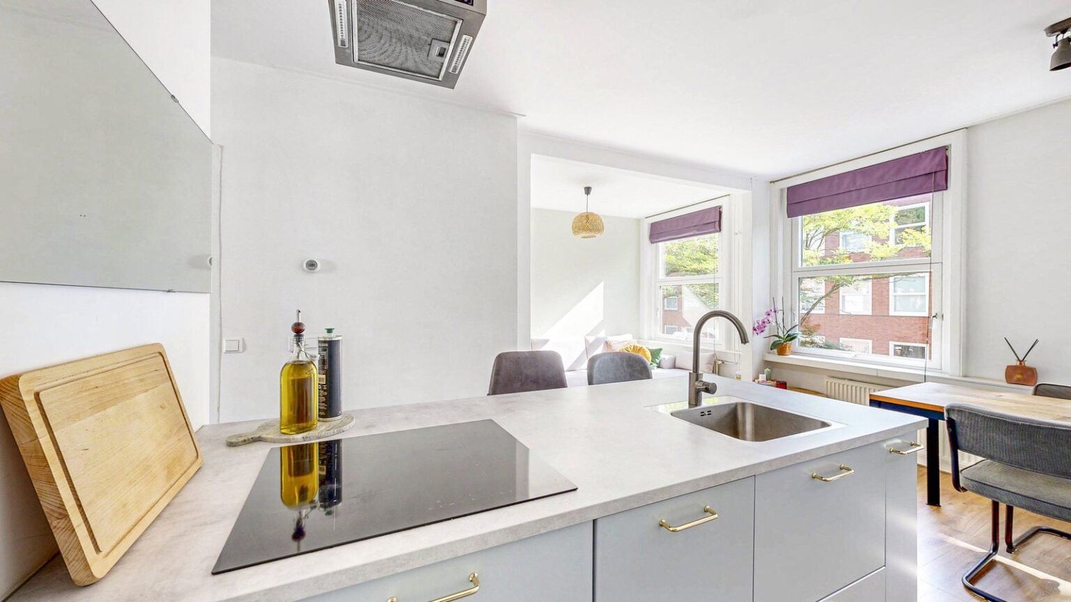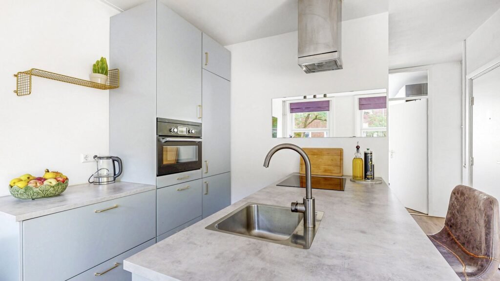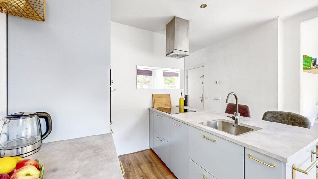 De indeling is doordacht en functioneel: aan de voorzijde bevindt zich de brede, lichte woonkamer met open keuken. Dankzij de drie draai-kiepramen en het dubbele glas valt hier veel natuurlijk licht binnen. De moderne keuken is een echte blikvanger, met een kookeiland en gezellige bar. Verder is de keuken voorzien van een inductiekookplaat, afzuigkap, vaatwasser, combi-oven en een koel-vriescombinatie. De slimme indeling zorgt voor veel werk- en opbergruimte, en de inbouwspotjes maken het geheel stijlvol af.