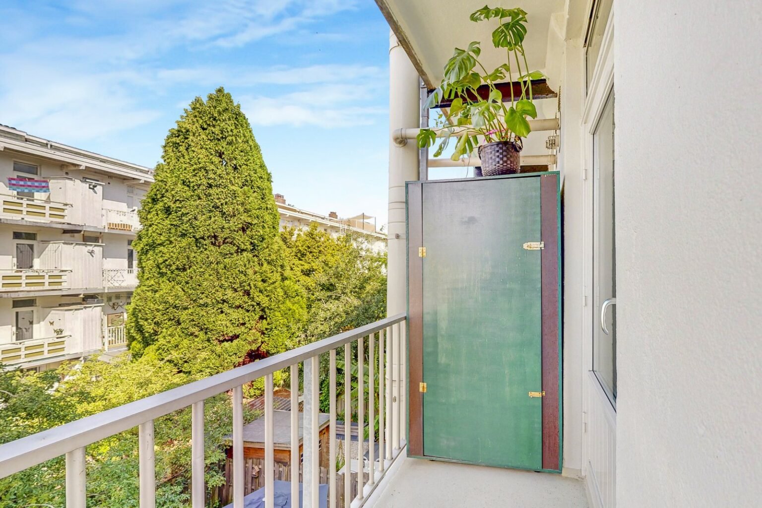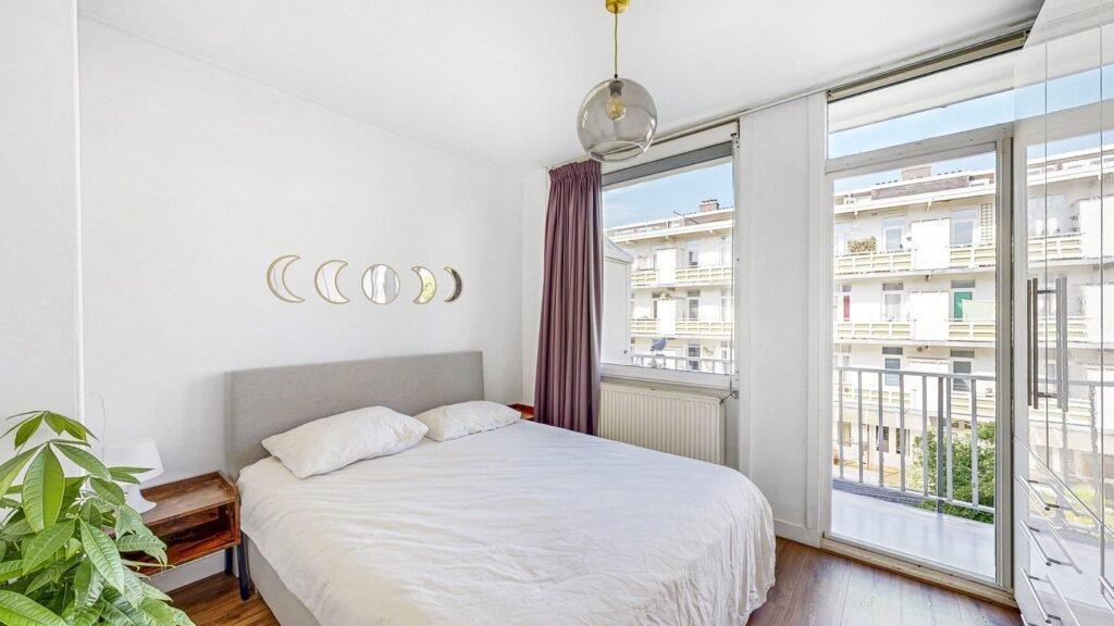 Aan de achterzijde liggen twee goed bemeten slaapkamers, beide met toegang tot het zonnige balkon op het westen. De grote slaapkamer biedt ruimte aan een tweepersoonsbed én een flinke kastenwand. Het balkon is een fijne buitenruimte met volop zon in de middag en avond. De twee balkonkasten zorgen voor extra bergruimte; in één ervan is de wasmachine fraai weggewerkt, met eventueel ruimte voor de cv-installatie.