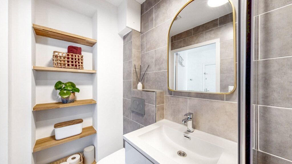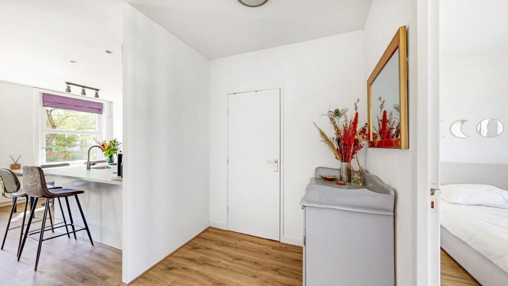 In het midden van de woning ligt een royale hal, ideaal voor extra kastruimte of eventueel een thuiswerkplek. De badkamer is compact maar praktisch ingedeeld met een douche, wastafelmeubel en toilet – fraai afgewerkt en klaar voor dagelijks comfort.