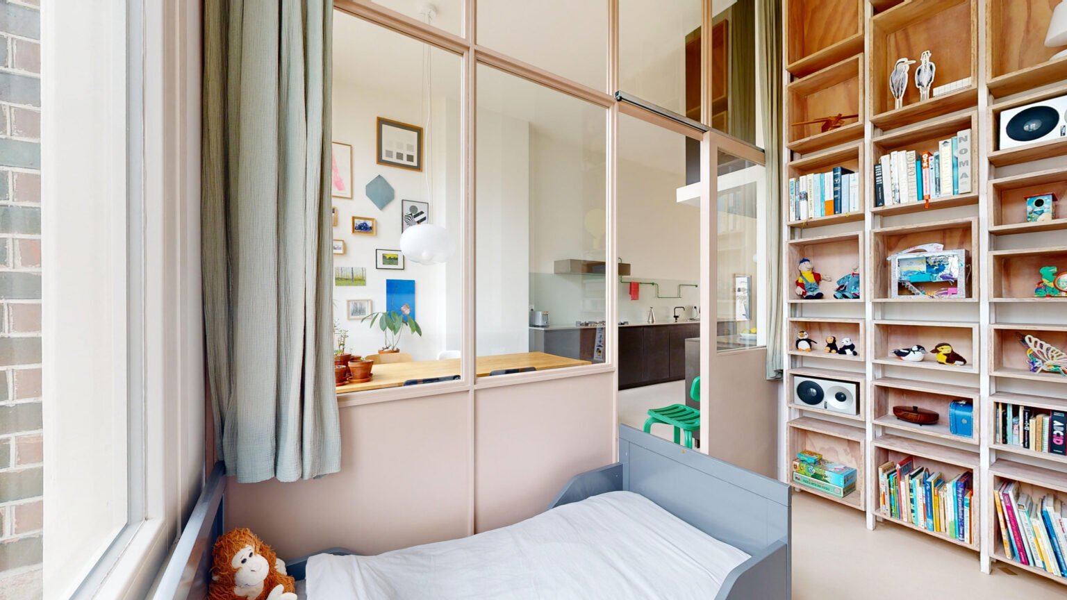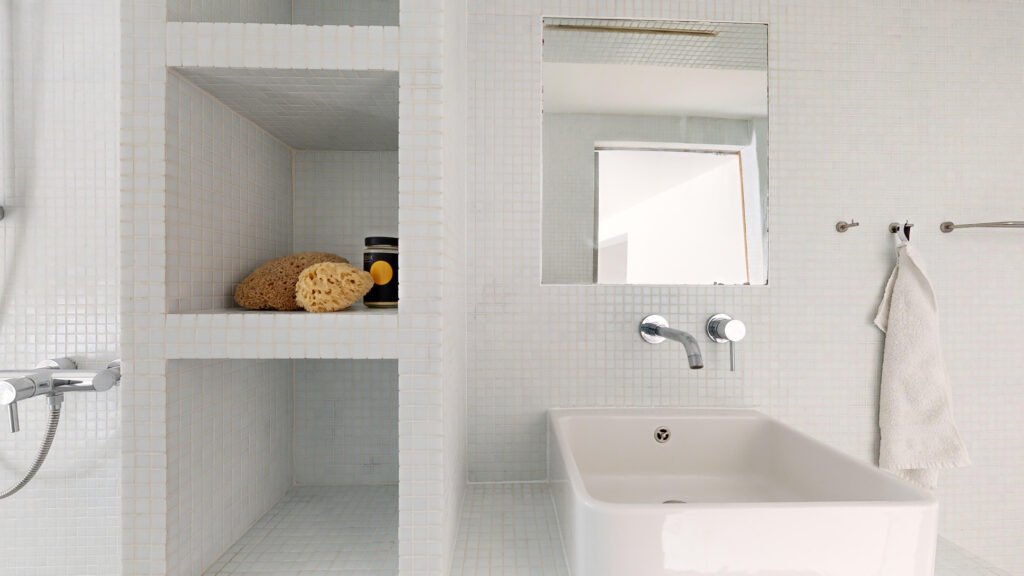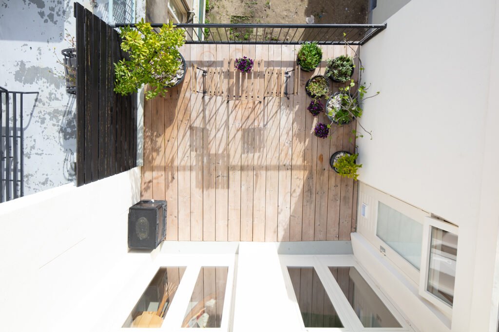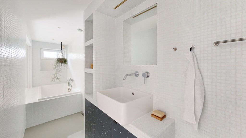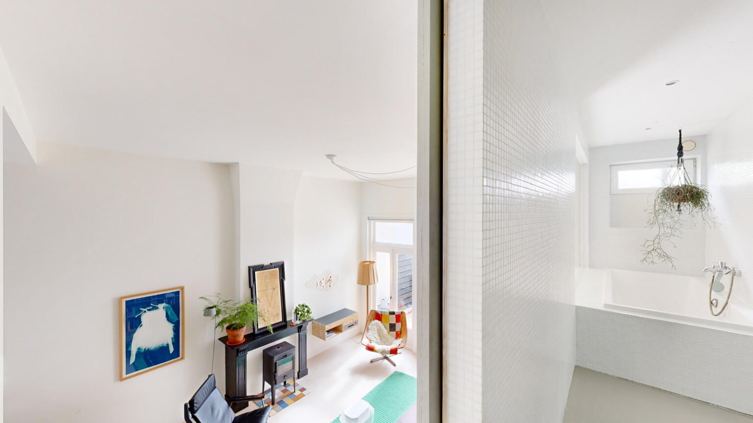 Het loft-effect wordt extra benadrukt door de “hoogte” van de badkamer. Deze is voorzien van een toilet, wastafelmeubel, verwarmde spiegel, inloopdouche en een afzonderlijk bad. Hoe heerlijk en uniek is het om vanuit bad uitzicht te hebben over je woonkamer en het dakterras.